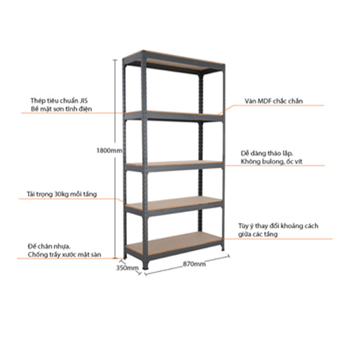 ♦Bửng ván MDF chắc chắn với tải trọng chịu lực 150 kg (30kg mỗi tầng). Khoảng cách giữa các tầng có thể điều chỉnh tùy ý.