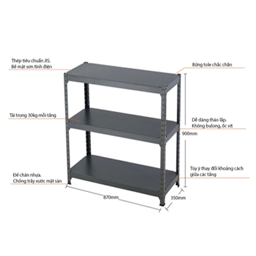 ♦ Bửng tole chắc chắn với tải trọng chịu lực 90 kg (30kg mỗi tầng). Khoảng cách giữa các tầng có thể điều chỉnh tùy ý.