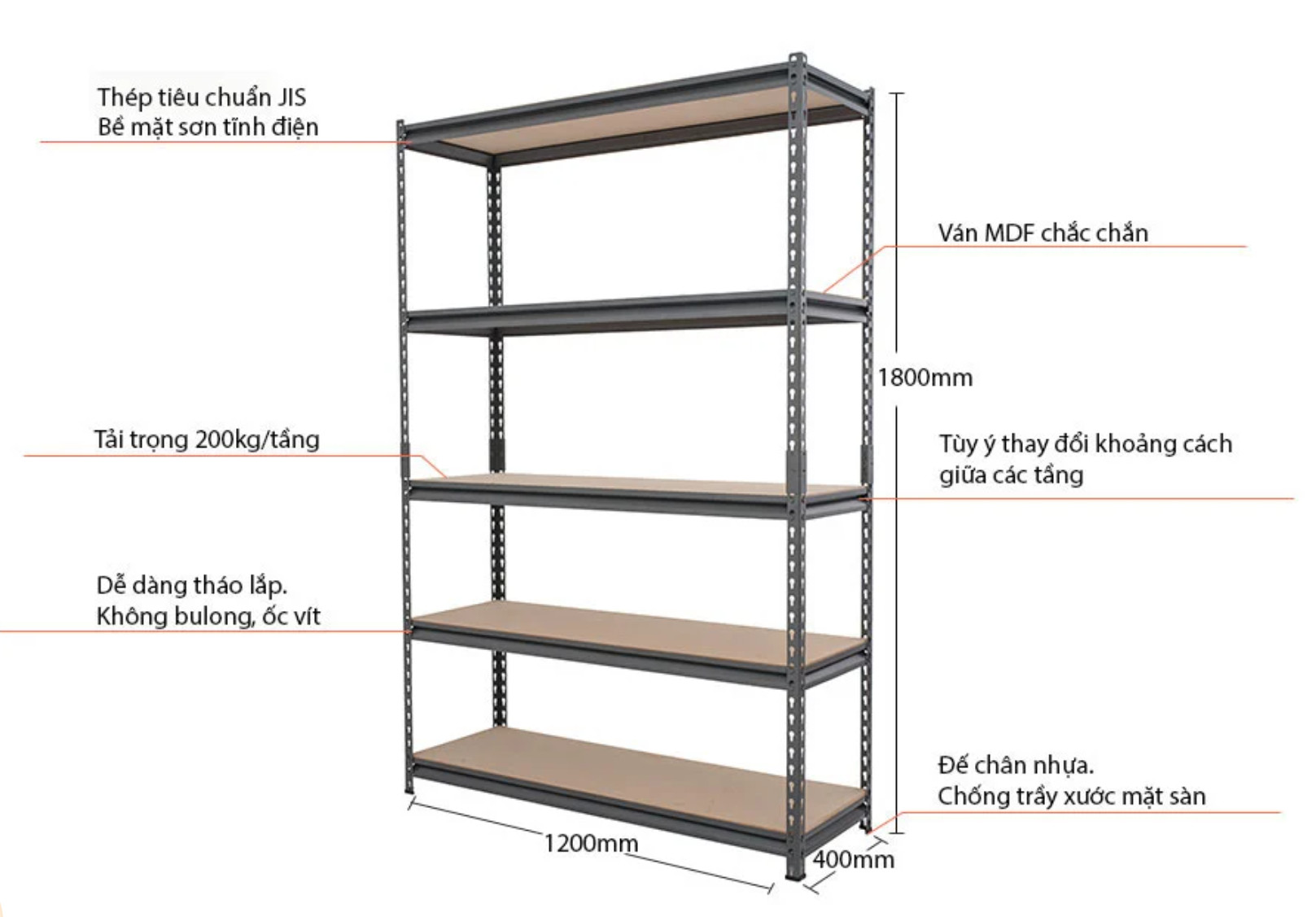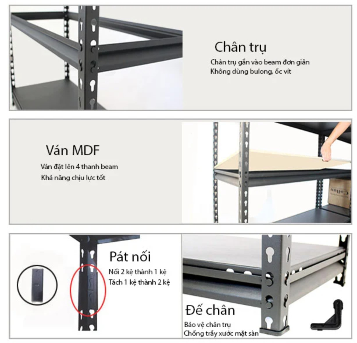 ♦Bửng ván MDF chắc chắn với tải trọng chịu lực 1.000 kg (200kg mỗi tầng). Khoảng cách giữa các tầng có thể điều chỉnh tùy ý.
