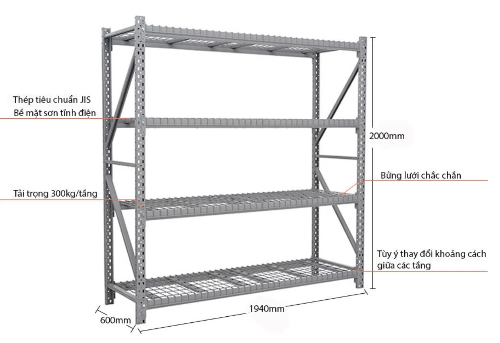 - Với tải trọng chịu lực 1.200 kg (300kg mỗi tầng). Khoảng cách giữa các tầng có thể điều chỉnh tùy ý.