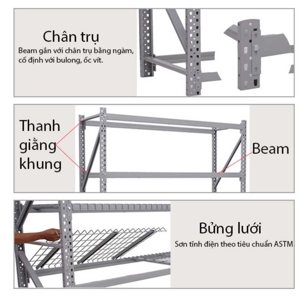 -Beam : mỗi tầng có hai thanh beam được gắn vào chân trụ vào chân trụ bằng bulong ốc vít.