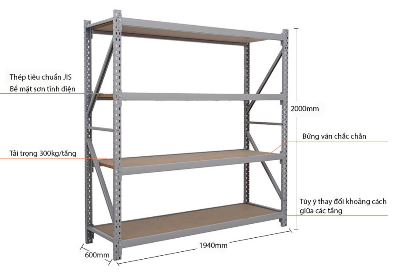 - Với tải trọng chịu lực 1.200 kg (300kg mỗi tầng). Khoảng cách giữa các tầng có thể điều chỉnh tùy ý.