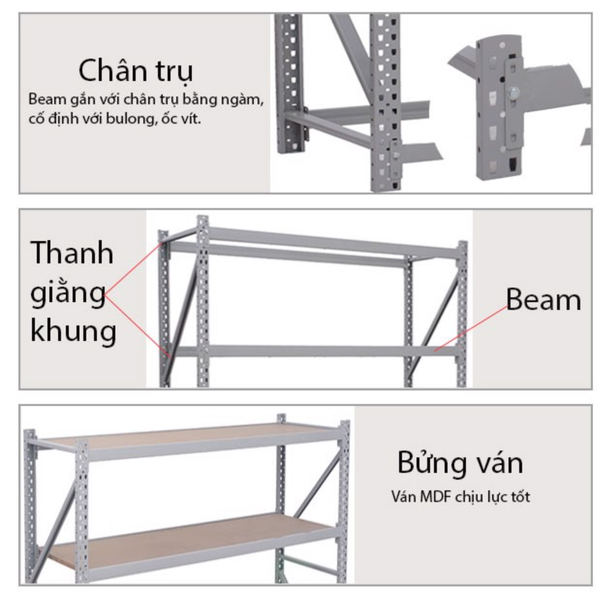 -Beam : mỗi tầng có hai thanh beam được gắn vào chân trụ vào chân trụ bằng bulong ốc vít.