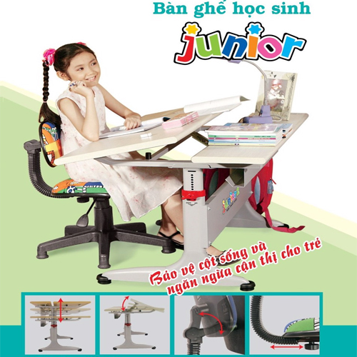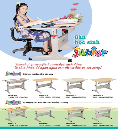 - Bàn học sinh BHS02-LG/BHS02B-LG (Bàn Junior ) với các tính năng điều chỉnh linh hoạt luôn phù hợp hoàn hảo với trẻ ở mọi giai đoạn phát triển và cung cấp sự hỗ trợ tối ưu cho hệ thống cột sống và cơ bắp, giúp trẻ ngồi học thoải mái trong 1 khoảng thời gian dài.