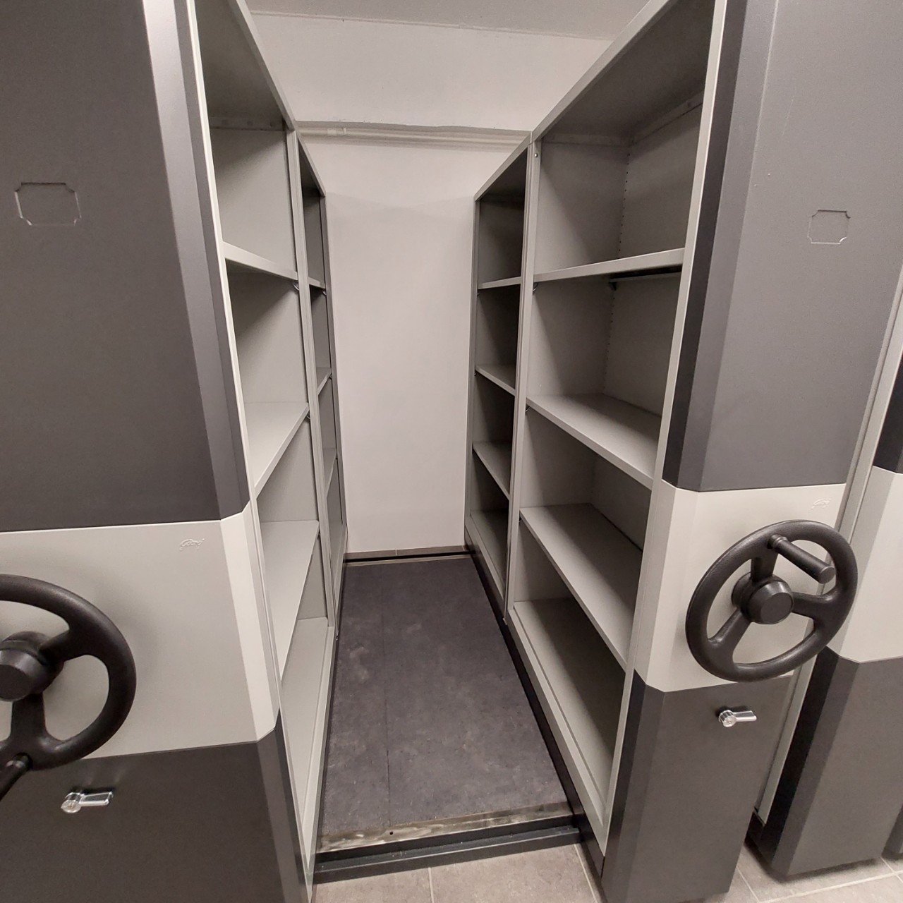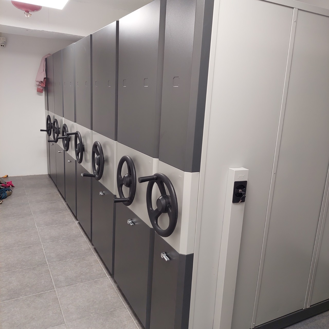- Tủ hồ sơ di động tay quay Mechanical compactor/ Mobile compactus : được thiết kế dạng module, với các module thân tủ được lắp trên hệ thống ray trượt và di chuyển trên đế trượt, với mặt đế trượt làm bằng thép không gỉ.
