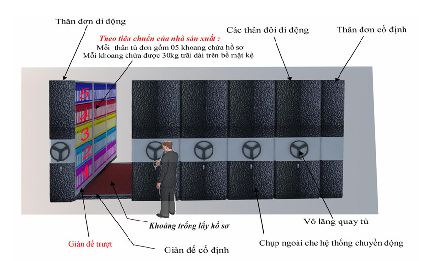 - Tổng số thân cho 1 bộ tủ compactor có thể thay đổi tùy theo yêu cầu của khách hàng. Tối thiểu là 4 thân (1 thân đơn di động, 1 thân đôi di động và 1 thân đơn cố định).